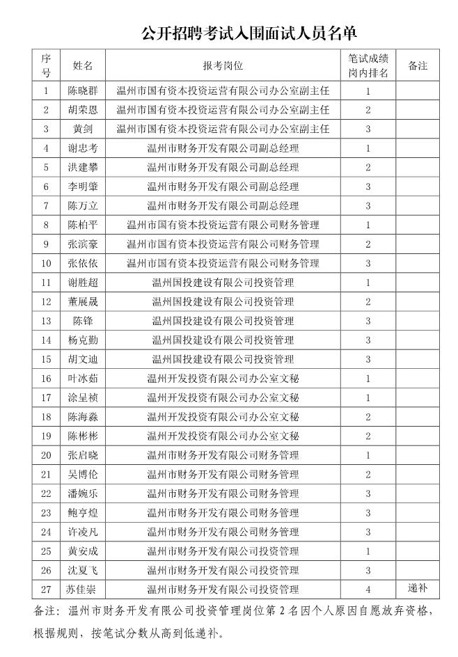 根據(jù)《溫州市國有資本投資運營有限公司關(guān)于引進全日制碩士研究生學(xué)歷人才的公告》等有關(guān)要求,現(xiàn)將綜合素質(zhì)評分及面試等有關(guān)事項公告如下: