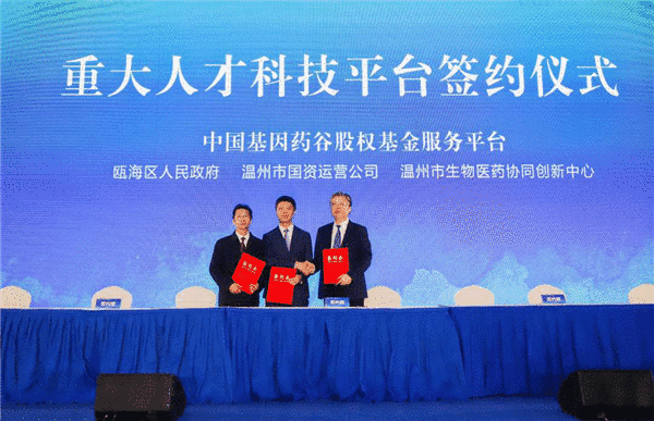 在10月20日我市重大人才科技平臺(tái)簽約儀式上,在市委副書(shū)記、市長(zhǎng)姚高員的見(jiàn)證下,溫州市國(guó)有資本投資運(yùn)營(yíng)有限公司與甌海區(qū)政府、溫州醫(yī)科大學(xué)簽訂戰(zhàn)略合作協(xié)議,共同發(fā)起組建總規(guī)模10億元的中國(guó)基因藥谷股權(quán)投資基金,打造浙江醫(yī)藥產(chǎn)業(yè)創(chuàng)新發(fā)展新模式,服務(wù)于中國(guó)基因藥谷的建設(shè)發(fā)展。