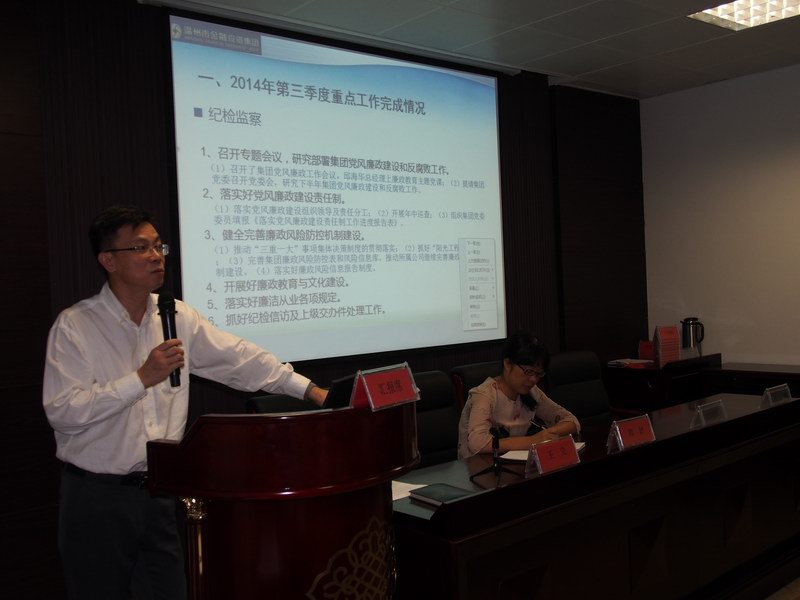 ? ?? ????按照流程,參加匯報會的單位負責人要在規(guī)定的八分鐘內(nèi),就今年三季度完成的重點工作和項目進行匯報,并由集團分管副總及總經(jīng)理做點評。 ?????當天的匯報會在緊張又熱烈的氛圍中進行。 ? ? 其中,溫州市金投融資擔保有限公司三季度業(yè)績亮點頻現(xiàn)。今年三季度,金投擔保公司嘗試開展高額履約保函業(yè)務(wù),累計完成29單非融業(yè)務(wù)類的履約保函,實現(xiàn)保額14.7億元。金投擔保公司通過與民營企業(yè)合作,開展非融業(yè)務(wù),極大的拓寬了該公司的業(yè)務(wù)渠道,截至今年九月,該公司已實現(xiàn)利潤三百萬元,為集團增收減虧作出了貢獻。 ? ?? ????集團總經(jīng)理邱海華對金投擔保三季度以來的工作表現(xiàn)予以充分肯定,邱海華認為,金投擔保相關(guān)負責人能夠以較大的魄力開拓業(yè)務(wù)渠道,并順利實現(xiàn)業(yè)績的快速增長,體現(xiàn)了該公司班子成員和團隊的齊心努力。 在匯報會相關(guān)流程結(jié)束后,集團總經(jīng)理邱海華就當天的匯報會做總結(jié)。邱海華強調(diào),本次匯報會較上半年的匯報會有了更扎實的作風,今天的匯報會絕大多數(shù)的部室、二級公司用數(shù)據(jù)說話,用事實說話,沒有空話大話,這是一個明顯的進步。 今后集團各部室、二級公司要以晉級升位為導向,勇于突破,要以十足的責任心推動項目和工作開展。碰到難題,不要繞著走,要克難攻堅,出路才會越來越多,今后項目要成熟一個推一個,要勇于嘗試。 最后,邱海華向在場的全體干部、職工提出要求,今后,在工作中要以更加務(wù)實的作風,通過效能建設(shè),狠抓整改,嚴明紀律,齊心協(xié)力建設(shè)一直打得響、戰(zhàn)斗力強勁的懂業(yè)務(wù)的復合型人才,為集團實現(xiàn)858戰(zhàn)略,順利推進集團轉(zhuǎn)型發(fā)展作出更大貢獻。 本次匯報會首次采用評分制,市國資委業(yè)績考核處處長羅勤、市金融辦市場監(jiān)管三處副處長張崇龍分別受邀擔任評委,集團班子成員、職工代表共計28人對匯報人員進行評分,并現(xiàn)場公布得分情況。 ? ? ? ? ? ? ? ? ? ? ? ? ? ? ? ? ? ? ? ? ? 集團總經(jīng)理邱海華作點評