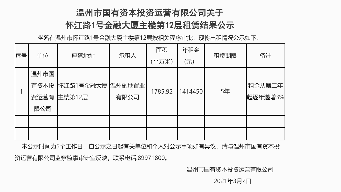 溫州市國有資本投資運營有限公司關(guān)于 懷江路1號金融大廈主樓第12層租賃結(jié)果公示