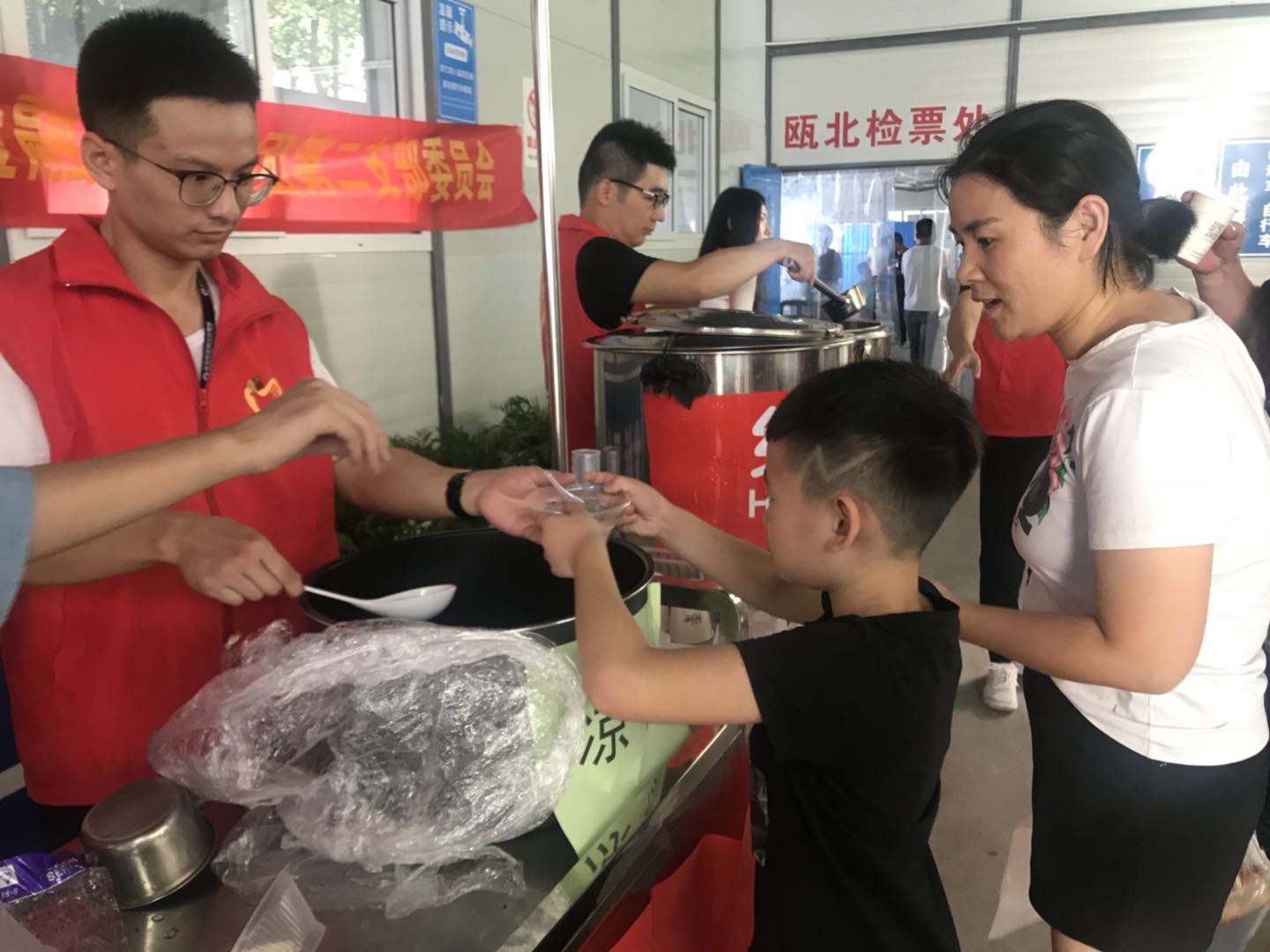 準(zhǔn)備工作完成之后,黨員們積極行動(dòng),將清涼飲品送給烈日下辛苦工作的工作人員、來(lái)往乘客和過(guò)路行人。在高溫中為大家送去絲絲清涼。黨員們還熱心地幫助渡輪乘客提大件行李,扶老攜幼
