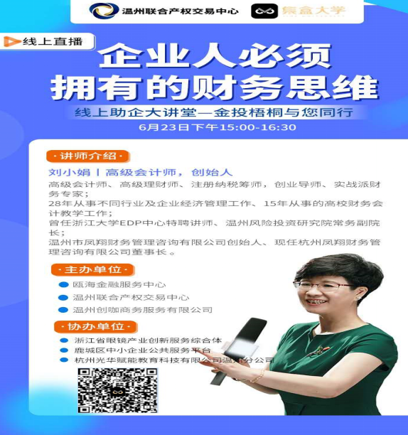 本次活動(dòng)邀請(qǐng)有15年高校財(cái)務(wù)會(huì)計(jì)教學(xué)經(jīng)驗(yàn)、曾任浙江大學(xué)EDP中心特聘講師、溫州風(fēng)險(xiǎn)投資研究院常務(wù)副院長(zhǎng)、溫州市鳳翔財(cái)務(wù)管理咨詢(xún)有限公司創(chuàng)始人劉小娟老師作為嘉賓,通過(guò)線(xiàn)上直播的形式,為溫州地區(qū)數(shù)百家企業(yè)講授以《企業(yè)人必須擁有的財(cái)務(wù)思維》為主題的課程。