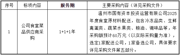 根據(jù)《溫州市市屬國(guó)有企業(yè)采購(gòu)管理辦法》(溫國(guó)資委〔2024〕第51號(hào))等有關(guān)規(guī)定,溫州民正招標(biāo)代理有限公司受溫州市國(guó)有資本投資運(yùn)營(yíng)有限公司委托,就公司食堂菜品供應(yīng)商采購(gòu)以公開招標(biāo)方式進(jìn)行國(guó)企采購(gòu),歡迎國(guó)內(nèi)合格的供應(yīng)商前來投標(biāo)。