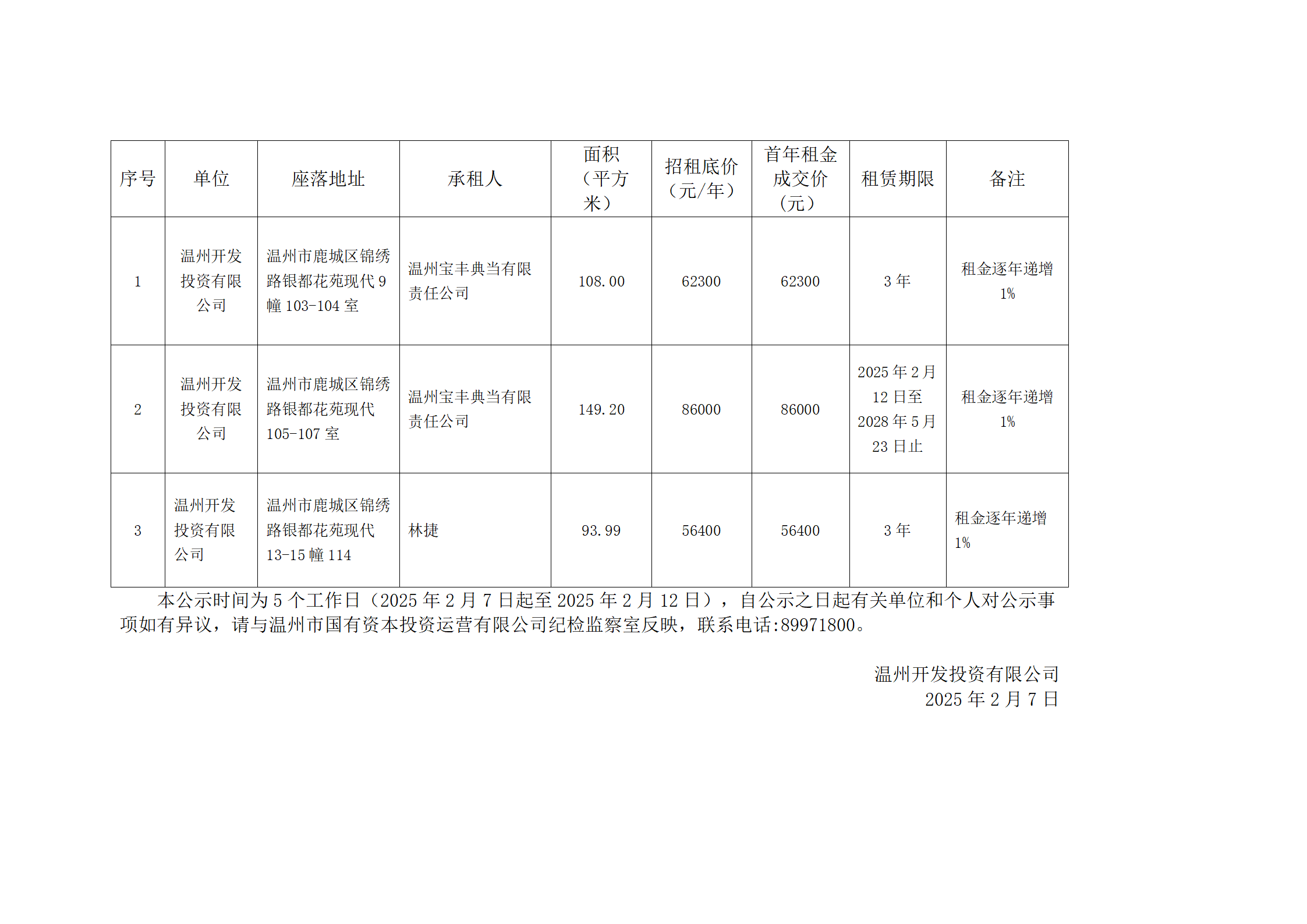 本公司坐落于溫州市鹿城區(qū)錦繡路銀都花苑9幢103-104室等房產(chǎn)于2025年1月23日-2025年2月5日公開(kāi)招租,現(xiàn)已成交,現(xiàn)將出租情況公示如下: