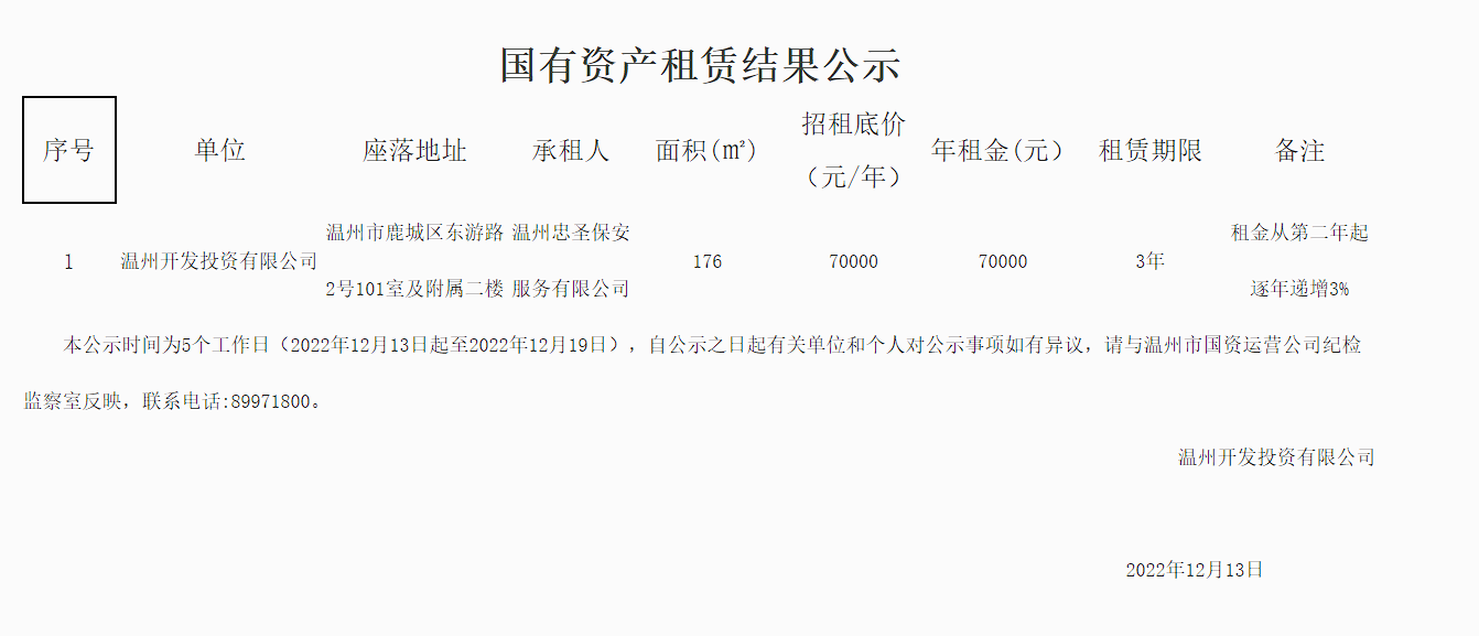 市國資運營公司下屬溫州開發(fā)投資有限公司關(guān)于溫州市鹿城區(qū)東游路2號101室及附屬二樓招租結(jié)果公示