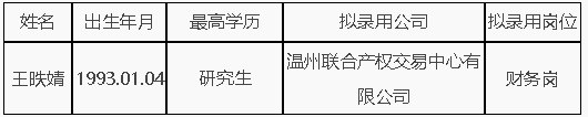 根據(jù)《溫州市國有資本投資運營有限公司關(guān)于開展高校應屆畢業(yè)生校園招聘的公告》、《溫州市國有資本投資運營有限公司高校應屆畢業(yè)生校園招聘放棄及遞補人員名單公布》,并按程序體檢、考察,經(jīng)公司黨委研究,王昳婧為溫州聯(lián)合產(chǎn)權(quán)交易中心有限公司財務崗擬錄用人選,具體公示如下: